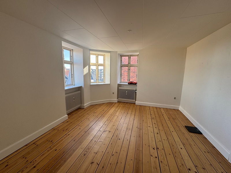 Lejligheden, der er beliggende på 3. sal, indeholder soveværelse og en rummelig stue opdelt i to stuer med åbning imellem, hvilket giver gode muligheder for indretning. Derudover er der køkken og badeværelse.